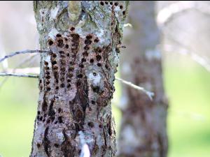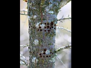 Sur cette photo, on observe de petits trous ovales, réparties en file horizontale. Ce tronc d’argousier mature est fortement affecté par le pic maculé. Les perforations faites...