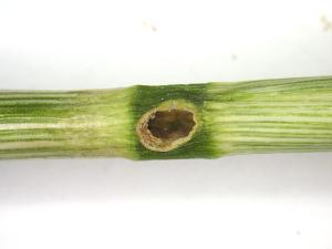 Dommages causés par le développement de la larve d'Oscinella pusilla sur une tige de blé de printemps. On observe le fendillement longitudinal à la base de la tige ainsi que l...