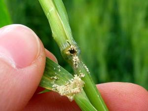 La face supérieure des feuilles de blé de printemps montre de minuscules taches blanches longitudinales concentrées vers l’apex de la feuille. Ces symptômes sont caractéristiq...