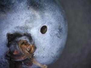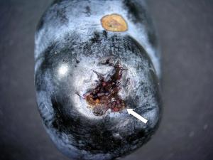 Un bleuet présentant un trou en surface qui se prolonge en galerie dans la chair. Plusieurs espèces sont susceptibles de causer ce type de dommages, notamment les tordeuses Gr...