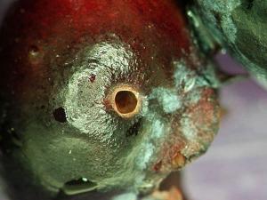 Un bleuet présentant un trou en surface qui se prolonge en galerie dans la chair. Des excréments sont aussi observables. Plusieurs espèces sont susceptibles de causer ce type ...