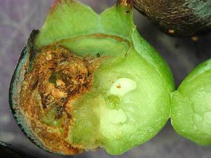 Coupe médiane d'un bleuet présentant une galerie causée par la pyrale des atocas. La femelle pond ses oeufs individuellement sous les lobes du fruit. La jeune larve perce un t...