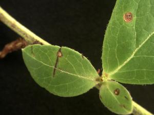Trois feuilles de bleuetier présentant des dommages causés par l'espèce Pseudanthonomus seriesetosus. Le grignotement observé résulte de l'alimentation des charançons adulte...