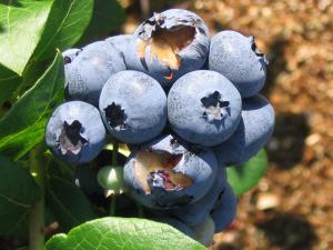 Sur des bleuets en corymbe, présence de blessures d’une forme angulaire sur l’épiderme et dans la chair. Ces dégâts sont causés par des oiseaux.
