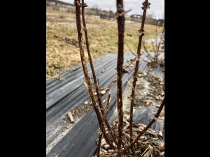 Tiges de camérisier grugées durant l’hiver par des campagnols. Les plants sont à proximité de hautes herbes où le couvert de neige était important, conditions qui favorisent l...