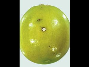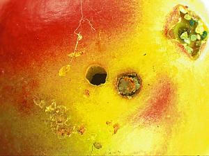Une canneberge présentant un trou (bloqué par de la soie) causé par la larve de la pyrale des atocas. La femelle pond ses oeufs individuellement sous les lobes du fruit. La je...