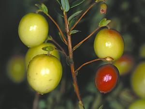 Une canneberge (en bas à droite) présentant un mûrissement prématuré causé par la pyrale des atocas. La femelle pond ses oeufs individuellement sous les lobes du fruit. La jeu...