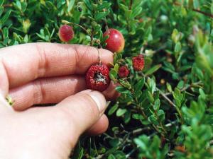 Canneberge présentant des dommages causés par une larve de seconde génération de la tordeuse soufrée. Au printemps, les larves hibernantes se nourrissent des nouvelles pousses...