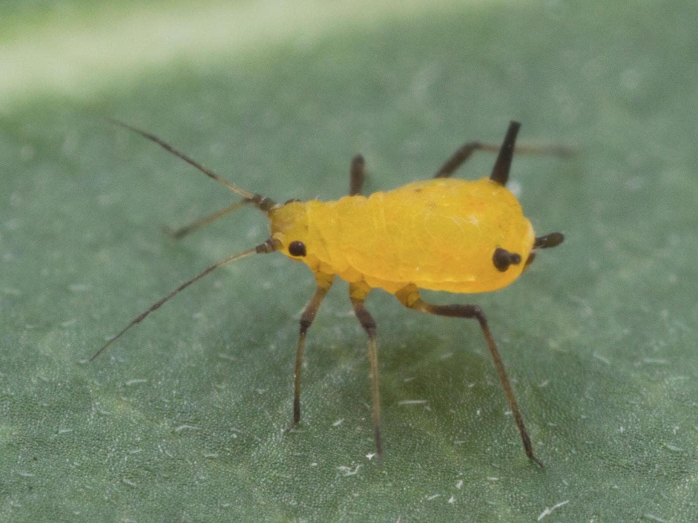 Adulte : 1,5 à 2,6 mm; le corps est jaune citron; les antennes, les pattes, les cornicules et la queue sont noires; les individus possédant des ailes ont la tête et une partie du thorax noirs.