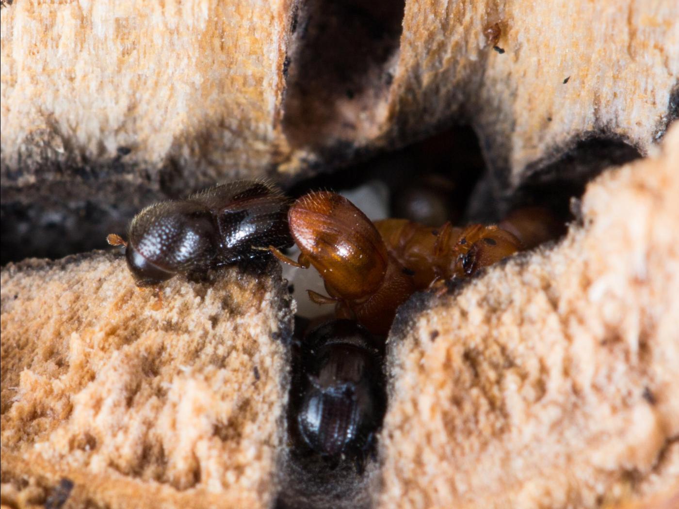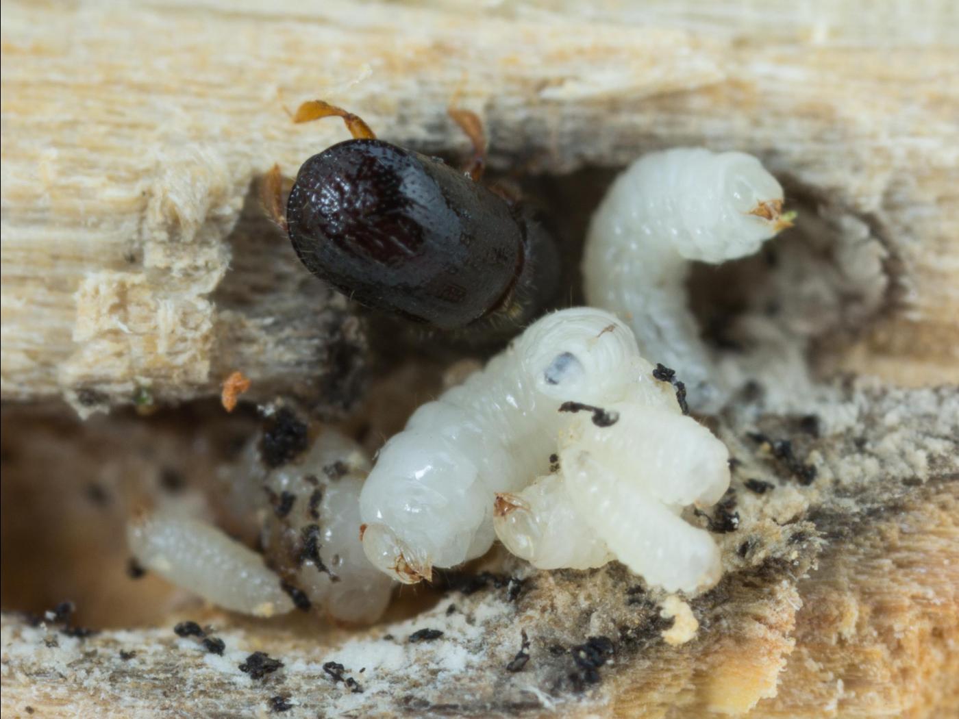 Après avoir terminé l’excavation et l’inoculation de la galerie et de la chambre, la femelle entame la ponte des œufs. Une moyenne de 16 œufs est pondue par chaque femelle à un rythme d’environ un par jour. Après une période d’incubation de trois à six jours, les œufs éclosent et les larves commencent à s’alimenter du mycélium présent sur les parois de la chambre. Le développement de la larve s’étale sur une période de 8 à 15 jours et trois stades larvaires sont complétés durant ce temps. Après avoir terminé sa croissance, la larve se transforme en pupe directement à l’intérieur de la chambre ou dans l’une des galeries reliées à celle-ci. La période de pupaison est de cinq à sept jours. Après s’être transformés en adulte, les individus restent à l’intérieur de la plante hôte où ils s’alimentent de champignons et s’accouplent en attendant la période hivernale. On retrouve généralement beaucoup plus de femelles que de mâles à l’intérieur des galeries. Un sex-ratio d’environ neuf femelles pour un mâle est généralement observé en milieu naturel.