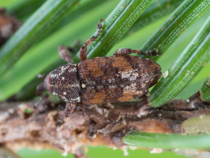 Adulte : 4,0 à 8,0 mm; la tête est brun foncé et supporte un long rostre; le thorax est brun foncé et est parsemé d'écailles blanches formant des taches et des lignes; les élytres sont recouverts d'écailles rousses et blanches, ces dernières formant de grosses taches dans la portion postérieure des élytres.