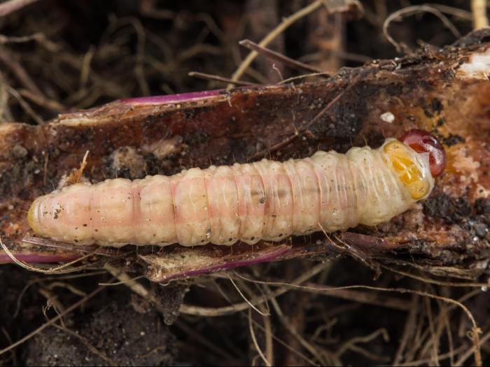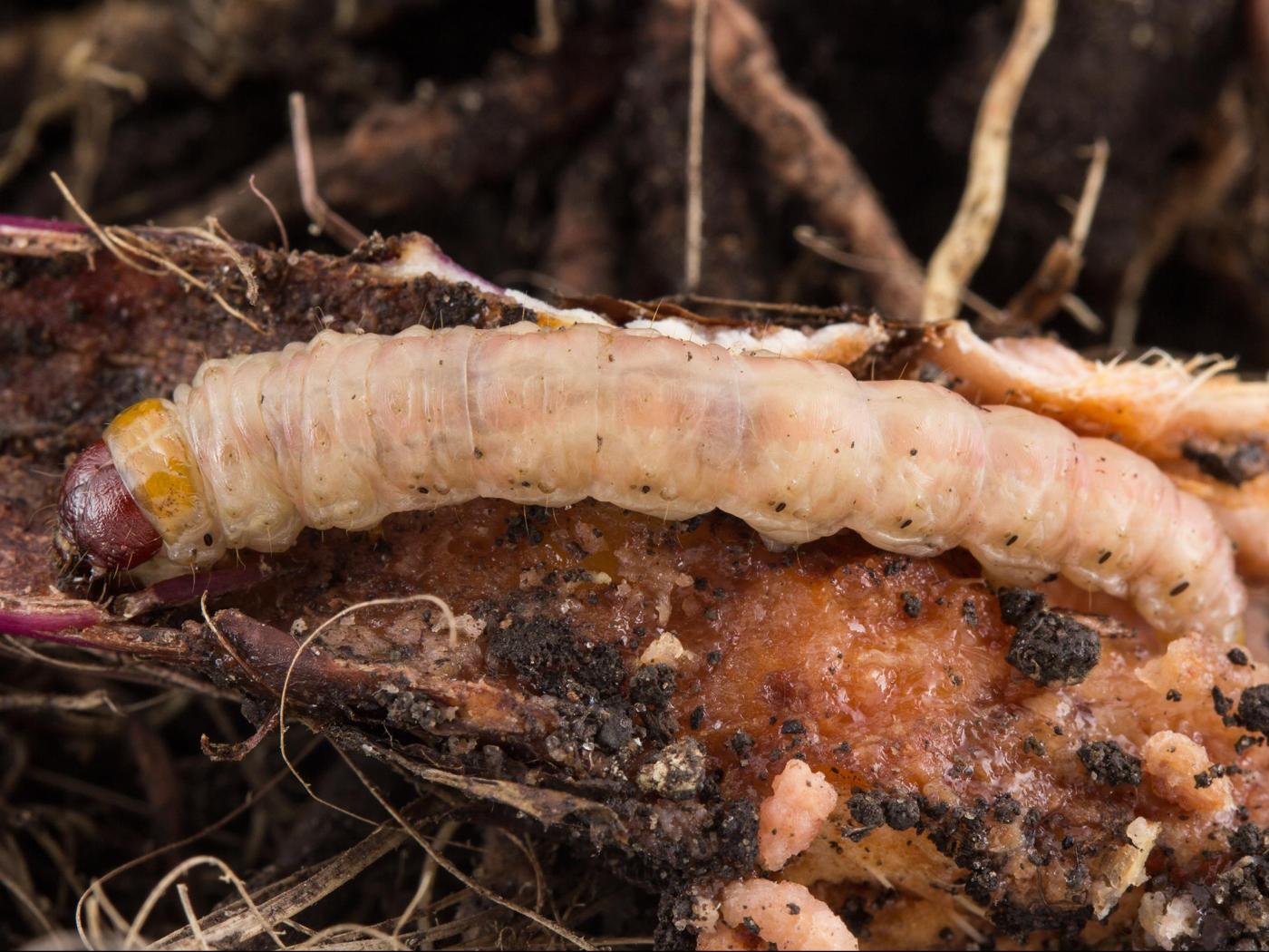 Ce ravageur peut causer d'importants dommages aux iris cultivés et sauvages. Les jeunes larves, en plus de creuser des mines, peuvent grignoter la bordure du feuillage et ainsi causer des dommages d'ordre esthétique. C'est cependant la larve plus mature qui est présente dans le rhizome qui cause les torts les plus considérables aux plantes attaquées. Une seule larve peut aisément tuer un iris en l'espace de quelques semaines. Il n'est pas rare de voir une larve s'attaquer à plusieurs rhizomes au courant de son développement. En plus de causer des dommages physiques importants aux rhizomes, les larves facilitent l'entrée de pathogènes secondaires, telles que des pourritures molles bactériennes et des champignons. Les rhizomes infectés par ces pathogènes vont fréquemment dégager des odeurs désagréables.