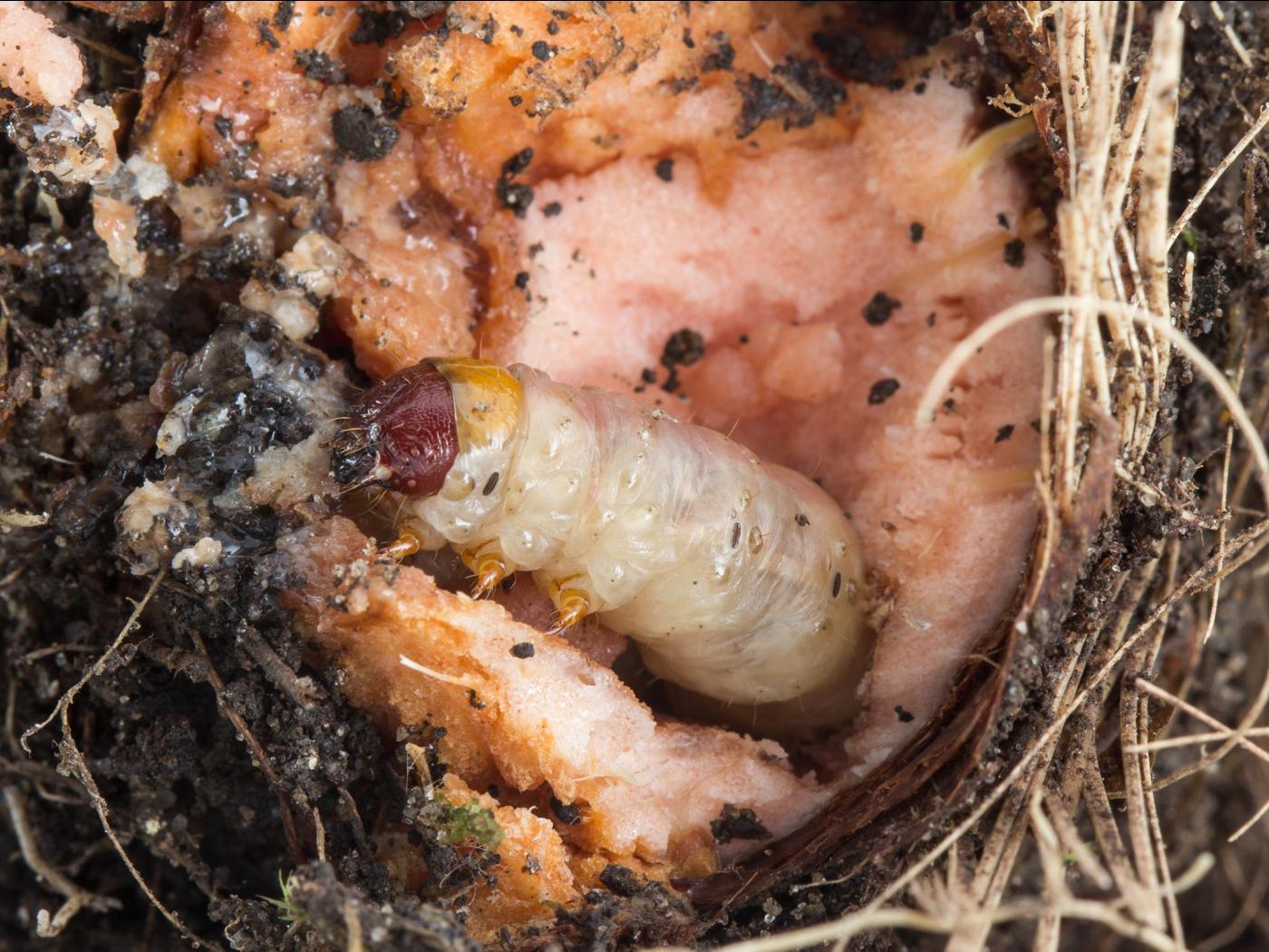 Larve : 35,0 mm à maturité; la tête est brun rougeâtre et parsemée de soies jaunâtres; le corps est beige rosé; les plaques thoracique et dorsale sont brunes; les stigmates sont entourés d'une ligne noire.