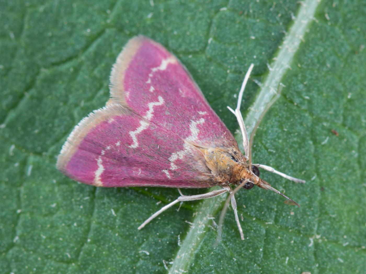 Adulte : envergure des ailes de 18,0 à 22,0 mm; la tête et le thorax sont beiges; les ailes antérieures sont rose foncé et traversées de deux lignes beiges en zigzag; les ailes postérieures sont brunâtres; les palpes labiaux sont contigus et projetés vers l'avant, ce qui donne l'impression qu'une protubérance conique est présente à l'avant de la tête.