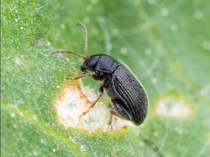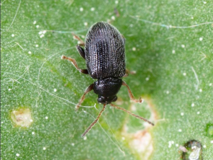 Adulte : 1,5 à 2,0 mm; le corps est noir et les élytres sont recouverts d’une fine pilosité blanchâtre; les antennes et les pattes sont brun pâle.
