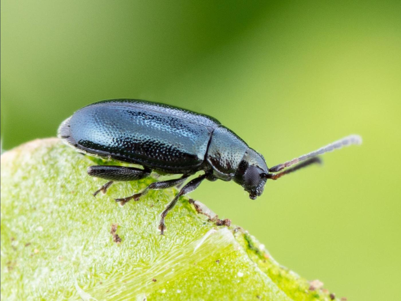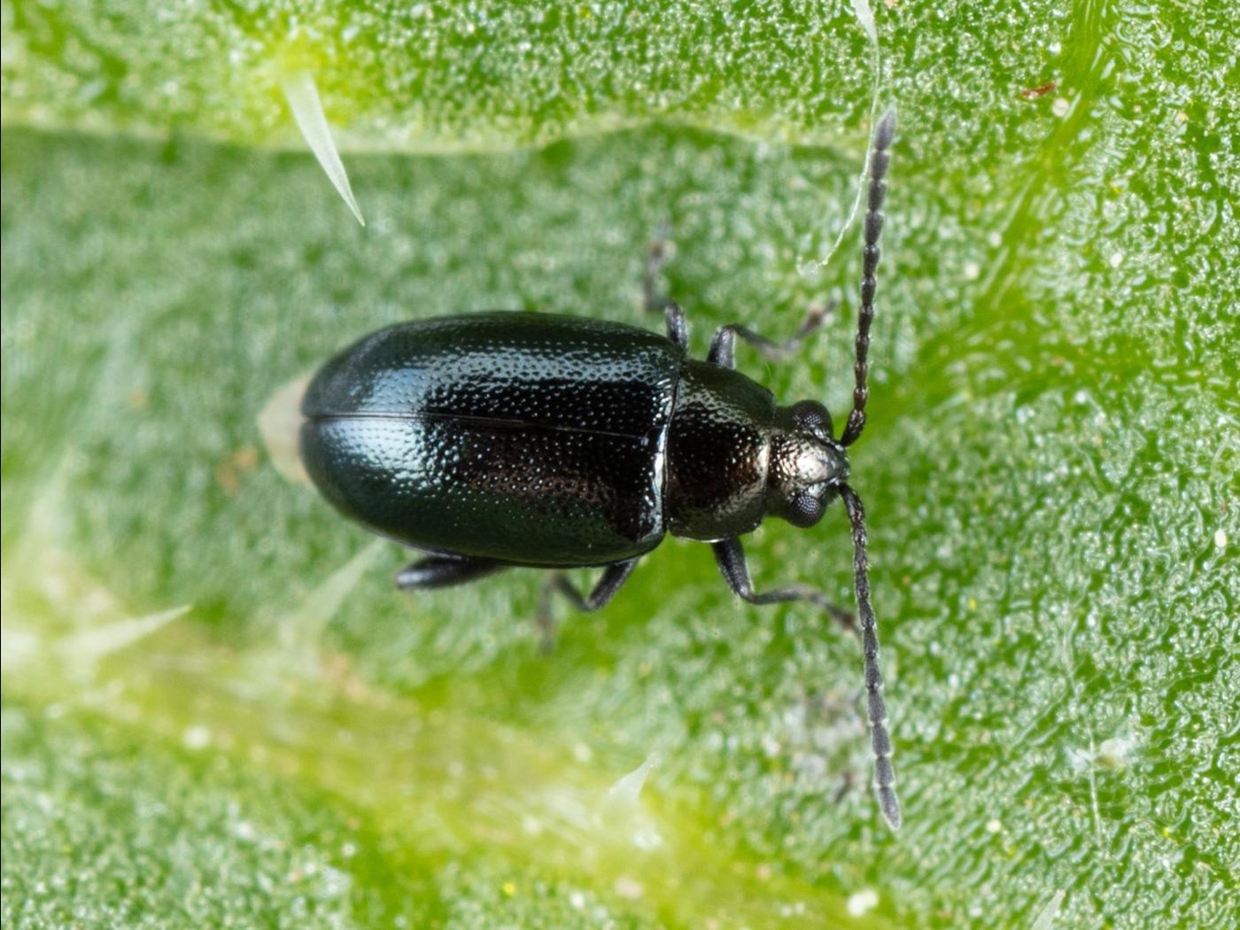 Adulte : 2,0 à 2,2 mm; le corps est de forme ovale; la coloration est noirâtre avec un reflet bleuté ou verdâtre; les premiers segments antennaires sont brunâtres; les fémurs arrière sont très larges.