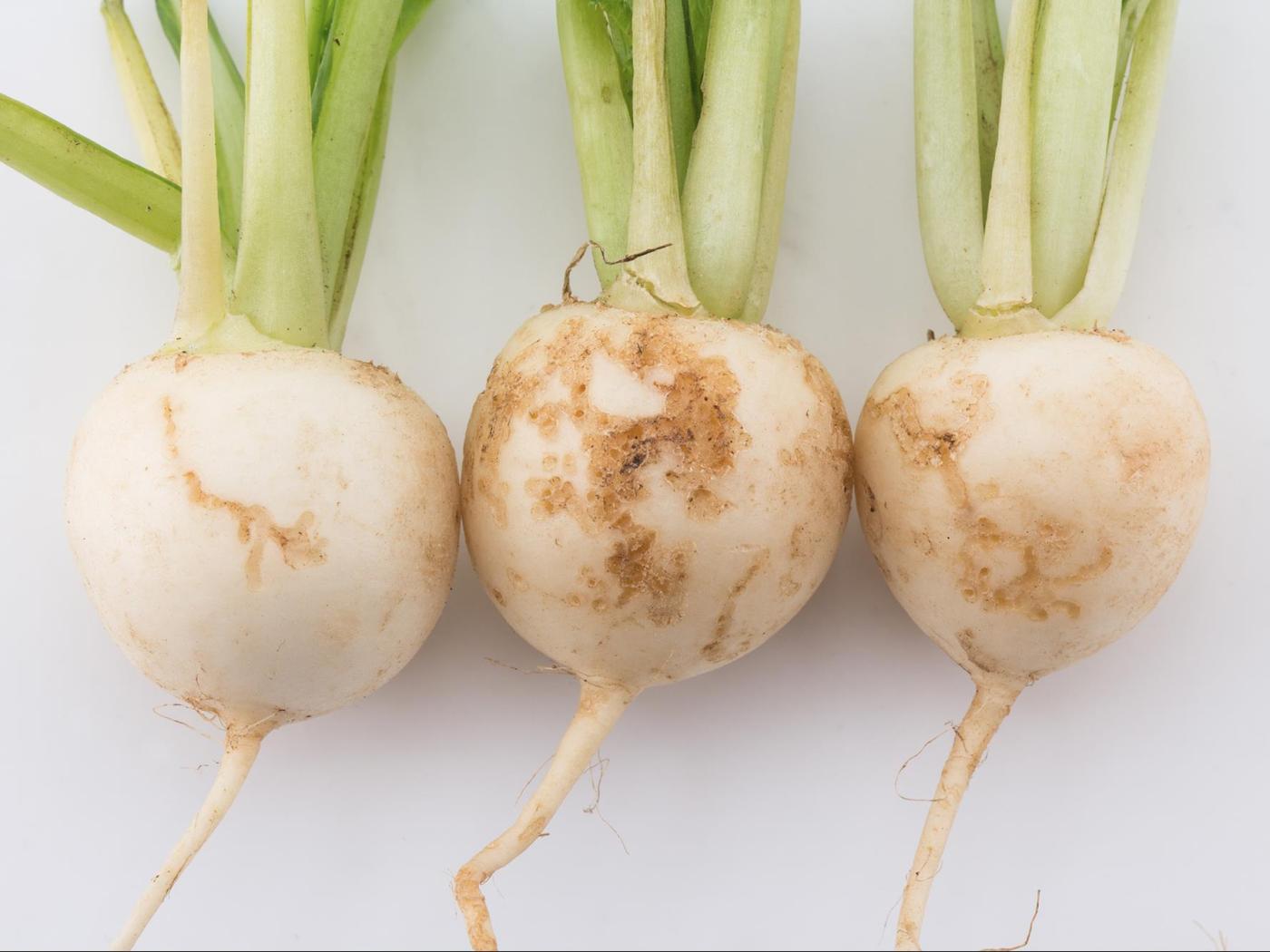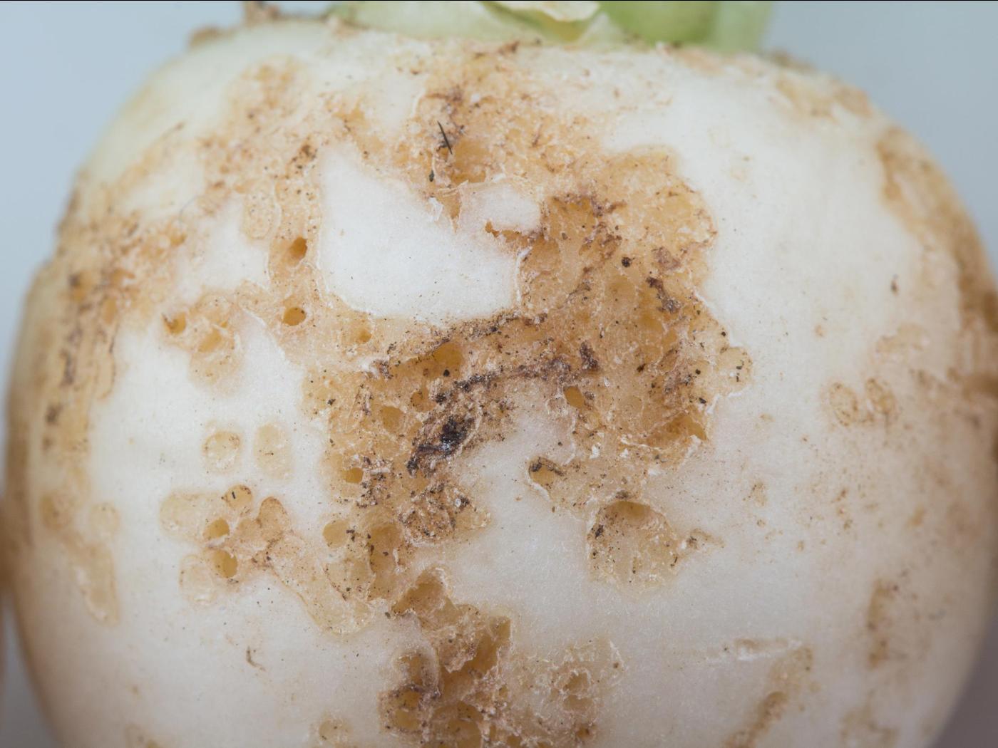 Description: Navet présentant des dommages de larves de l'altise des navets : les larves de cette espèce se nourrissent des racines de leurs plantes hôtes. Les racines de navets attaquées par Phyllotreta striolata sont recouvertes de galeries superficielles. Des galeries plus profondes sont aussi parfois présentes.
