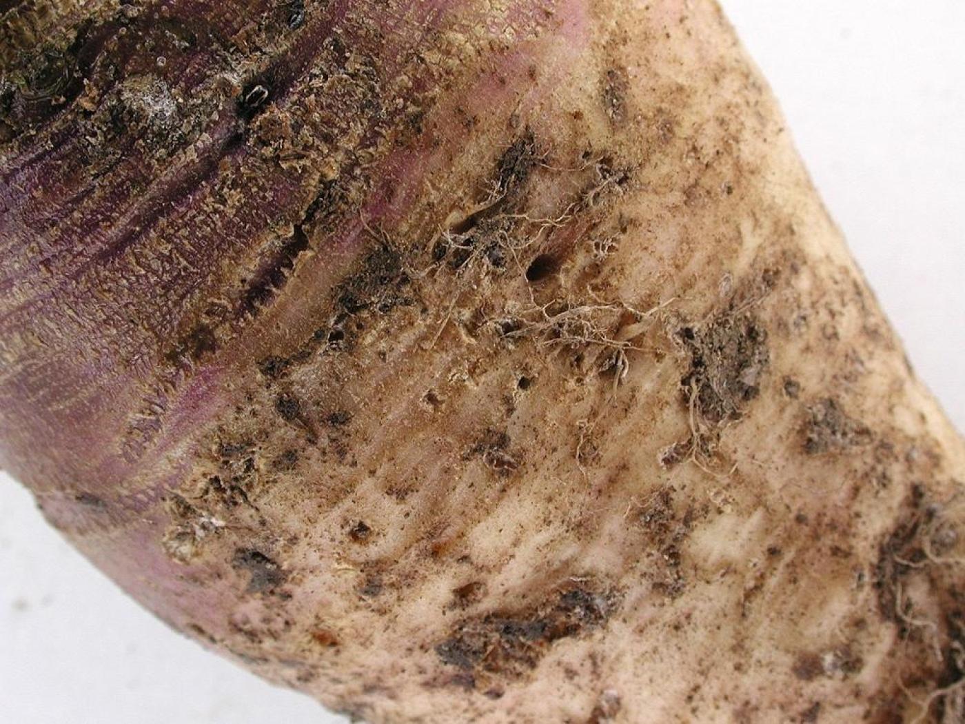 Description: Rutabaga présentant des dommages de larves de l'altise des navets: les larves se nourrissent des racines. Dans le cas des légumes racine comme le rutabaga et le radis, elles grignotent des tranchées à la surface de la racine principale, ce qui cause des dommages suffisament importants pour empêcher leur commercialisation.
