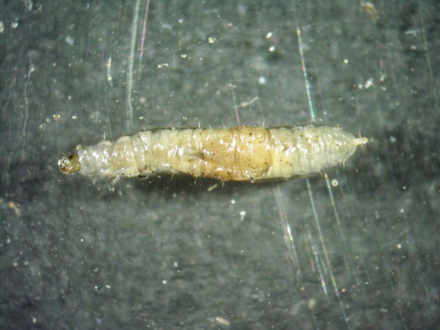 Larve : 8,0 mm à maturité; le corps est blanchâtre et de forme cylindrique; la tête est jaune brunâtre et est plus petite que le premier segment thoracique; le dernier segment abdominal porte un tubercule anal sur lequel une touffe de soies est présente; la tête et le corps de la larve sont recouverts de petites soies éparses.