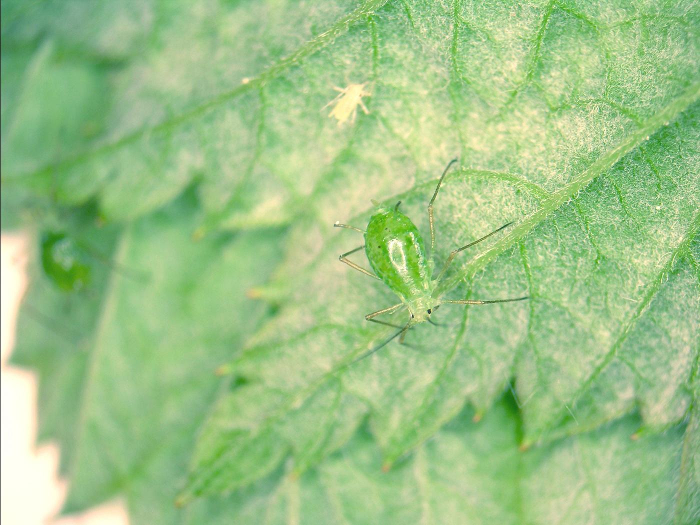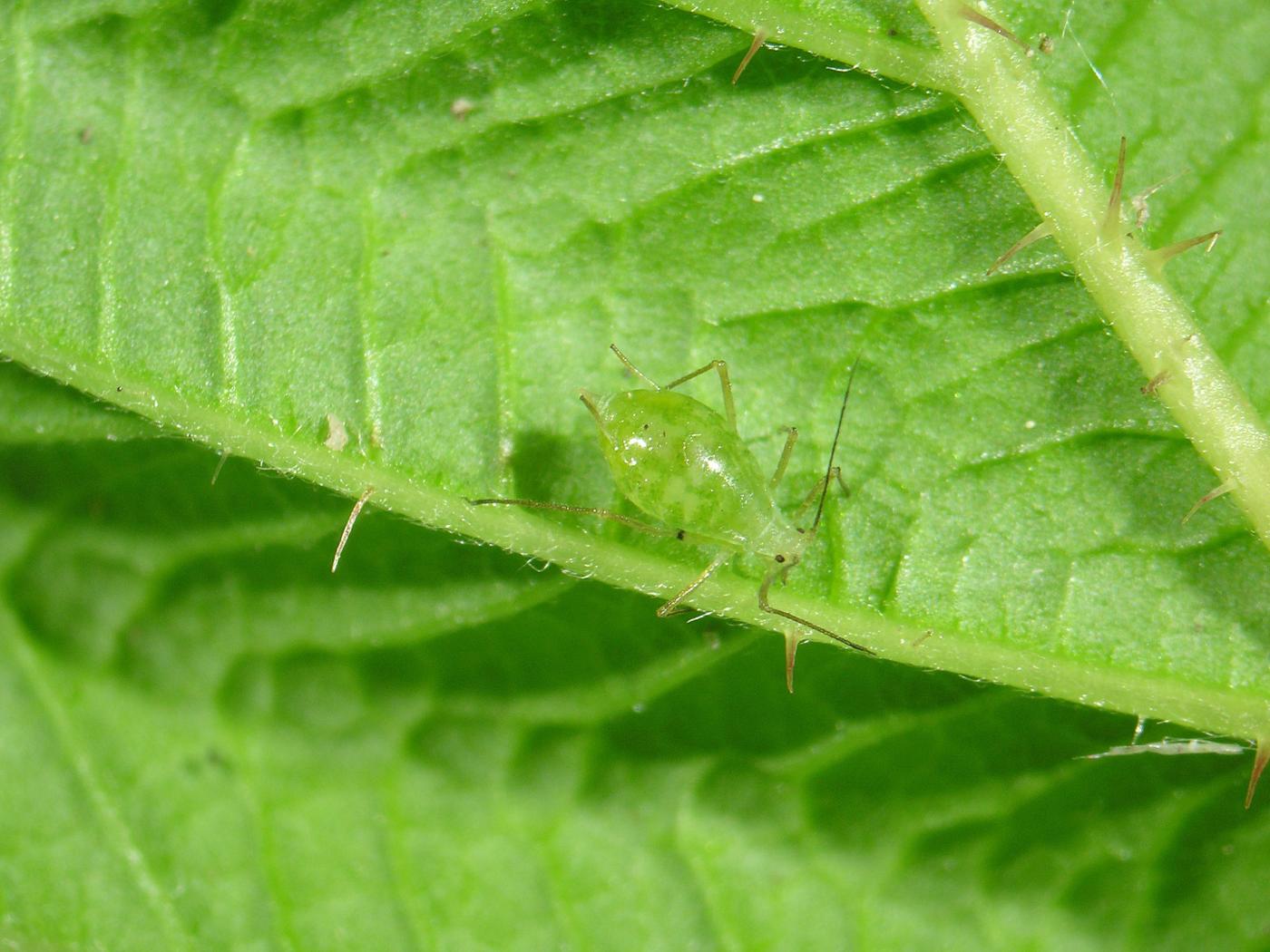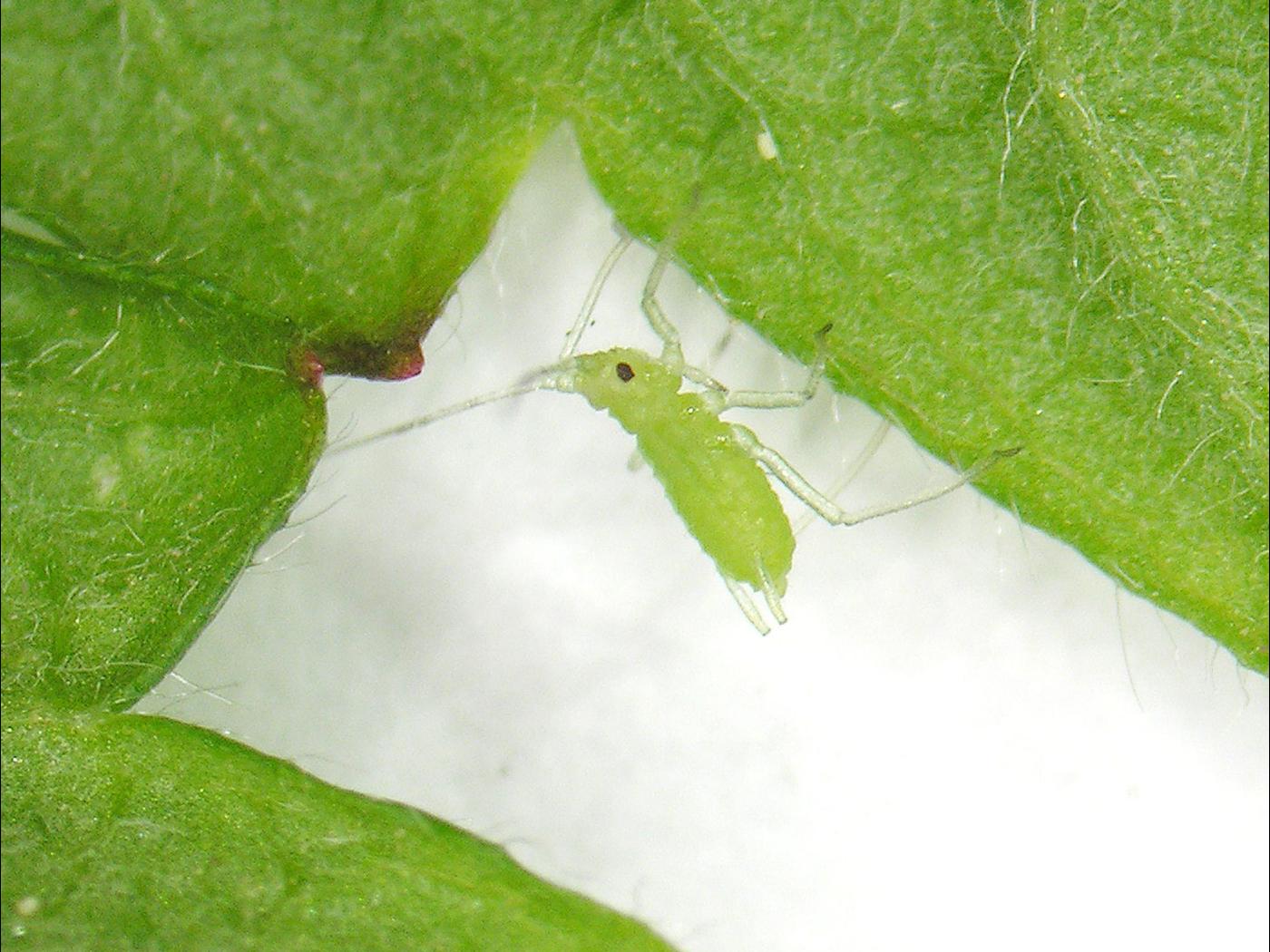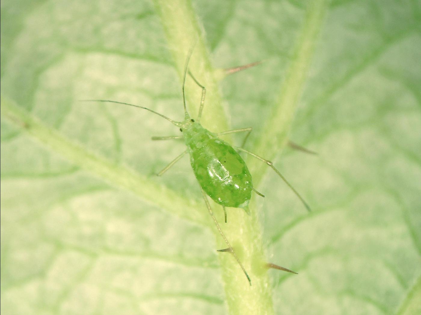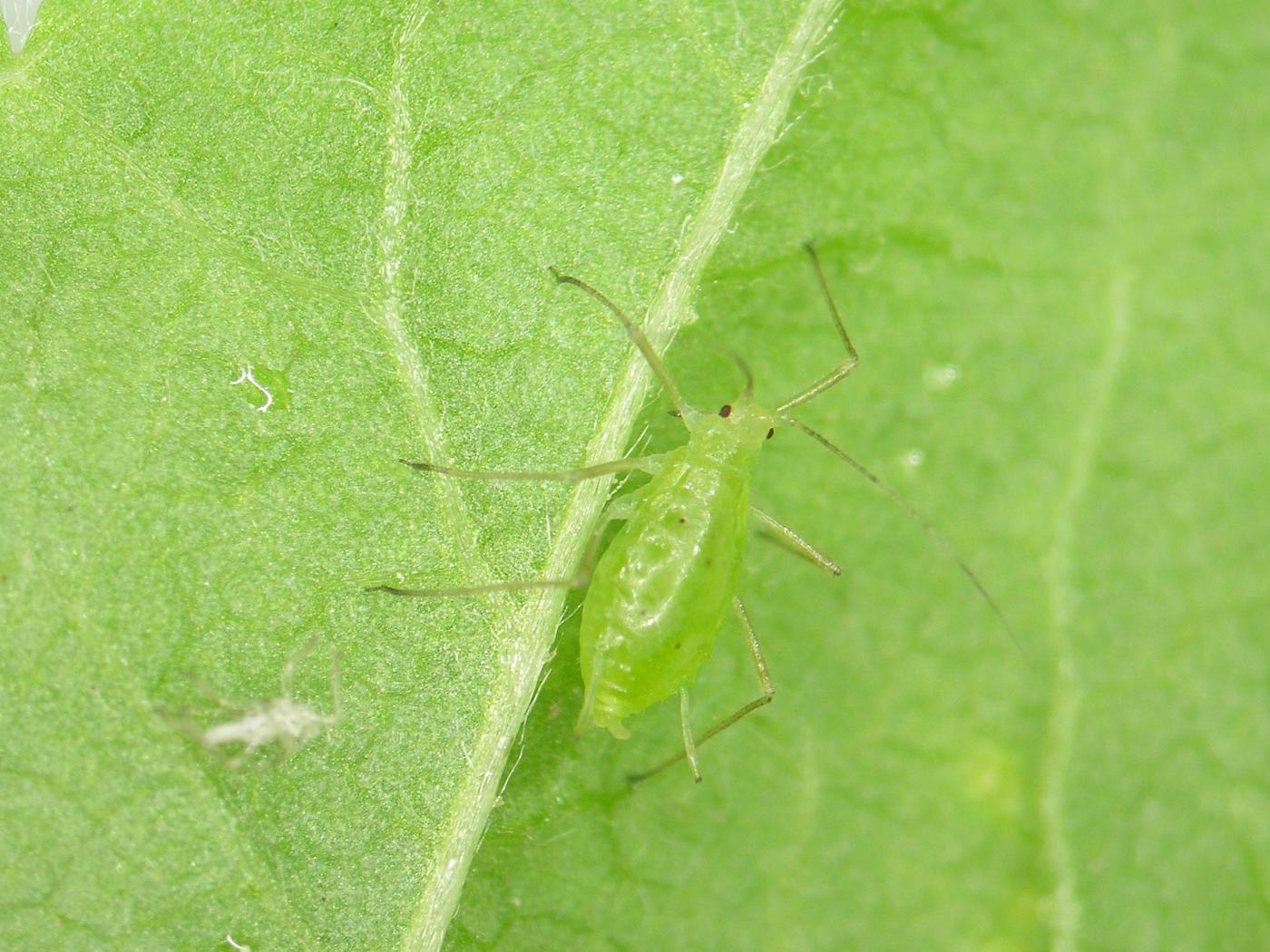 Larve : 2,4 à 3,0 mm à maturité; le corps est vert pâle; les antennes, les pattes et les cornicules sont vert translucide.
