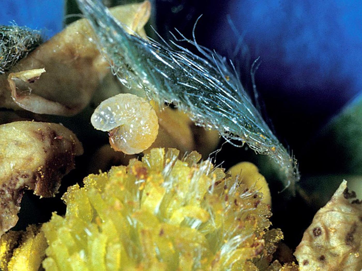 Larve : 3,0 à 6,0 mm à maturité; le corps est en forme de croissant et est dépourvu de pattes thoraciques; la tête est brune; le reste du corps est de couleur crème.