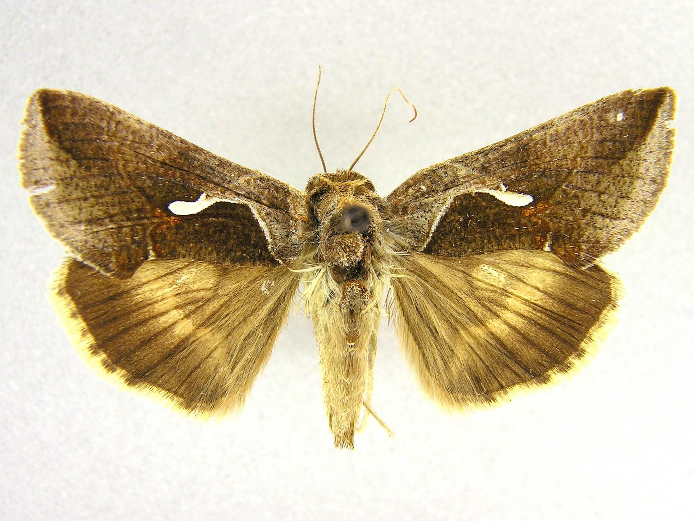 Adulte : envergure des ailes de 35,0 à 40,0 mm; les ailes sont brunes avec une tache blanche au milieu de l'aile antérieure; une ligne blanche se poursuit de la base de la tache et se recourbe pour atteindre la marge postérieure à la base de l'aile; l’aile postérieure est plus foncée dans la région submarginale et marginale.