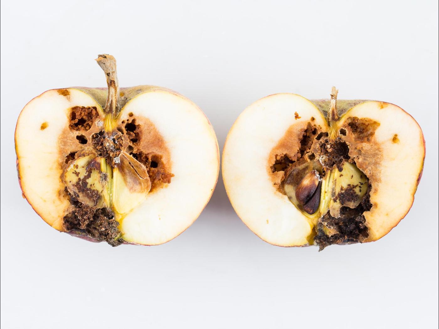 Description: Amas d'excréments de carpocapse de la pomme : la larve de Cydia pomonella creuse de larges galeries atteignant le cœur des pommes. De grandes quantités d'excréments brun-rougeâtre sont présentes à l'intérieur de la galerie ainsi qu'au point d'entrée dans le fruit.