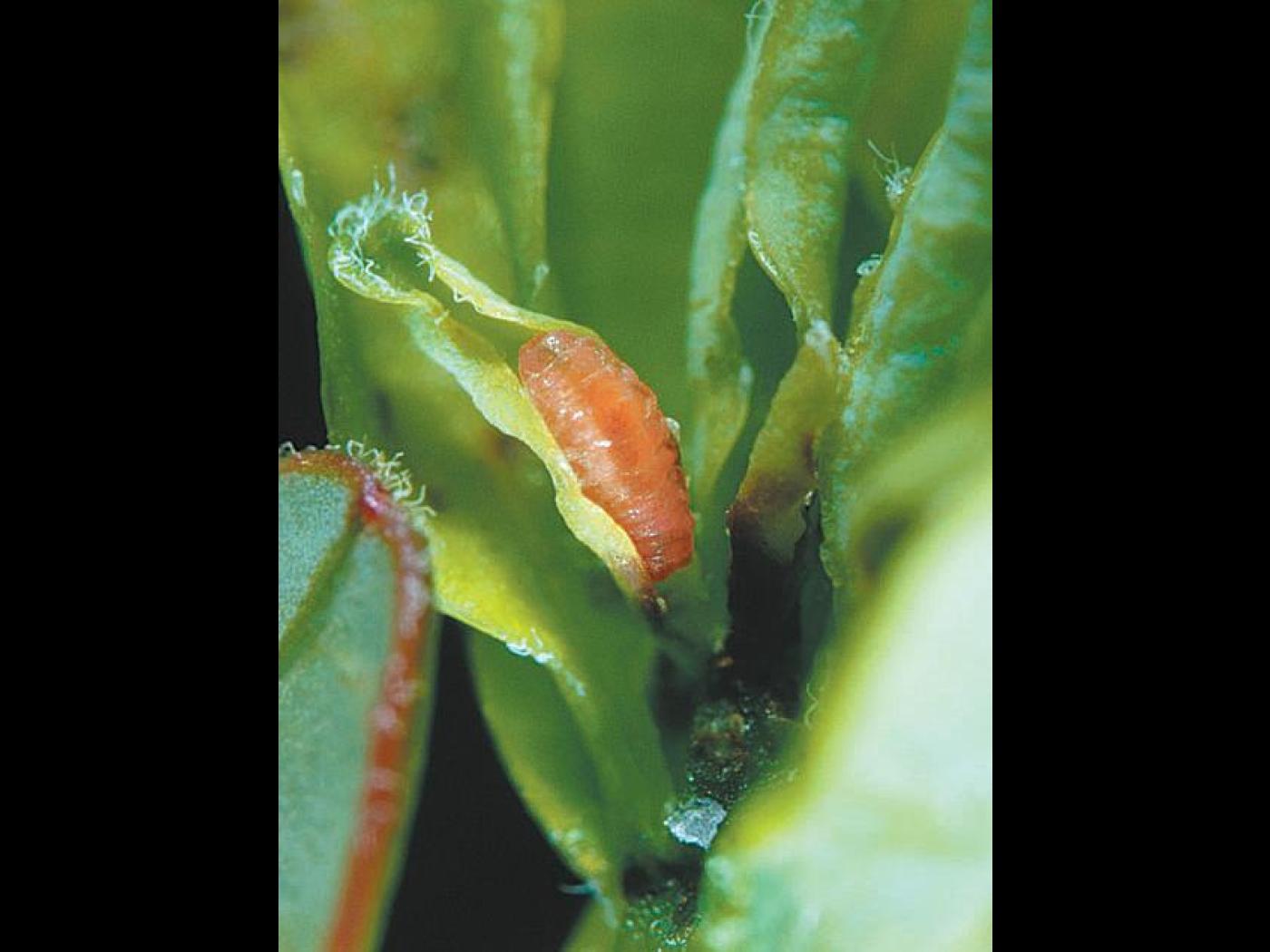 Larve : 1,5 à 2,0 mm à maturité; leur coloration est variable au fil de leur développement; la jeune larve est transparente et devient blanche par la suite; les derniers stades sont plutôt oranges ou rosés; les côtés de la larve sont lobés.