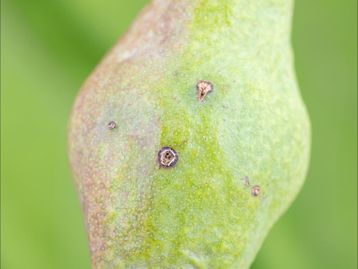 Description: Lorsqu'elles sont attaquées par le charançon de la pomme tôt dans leur développement, les poires se déforment de façon importante. Ce sont les trous creusés par les adultes qui s'alimentent de la chair des jeunes fruits qui cause une croissance inégale des tissus. Ces trous sont aussi creusés par les femelles qui préfèrent déposer leurs oeufs directement à l'intérieur du fruit pour éviter qu'ils soient parasités ou mangés par des prédateurs.