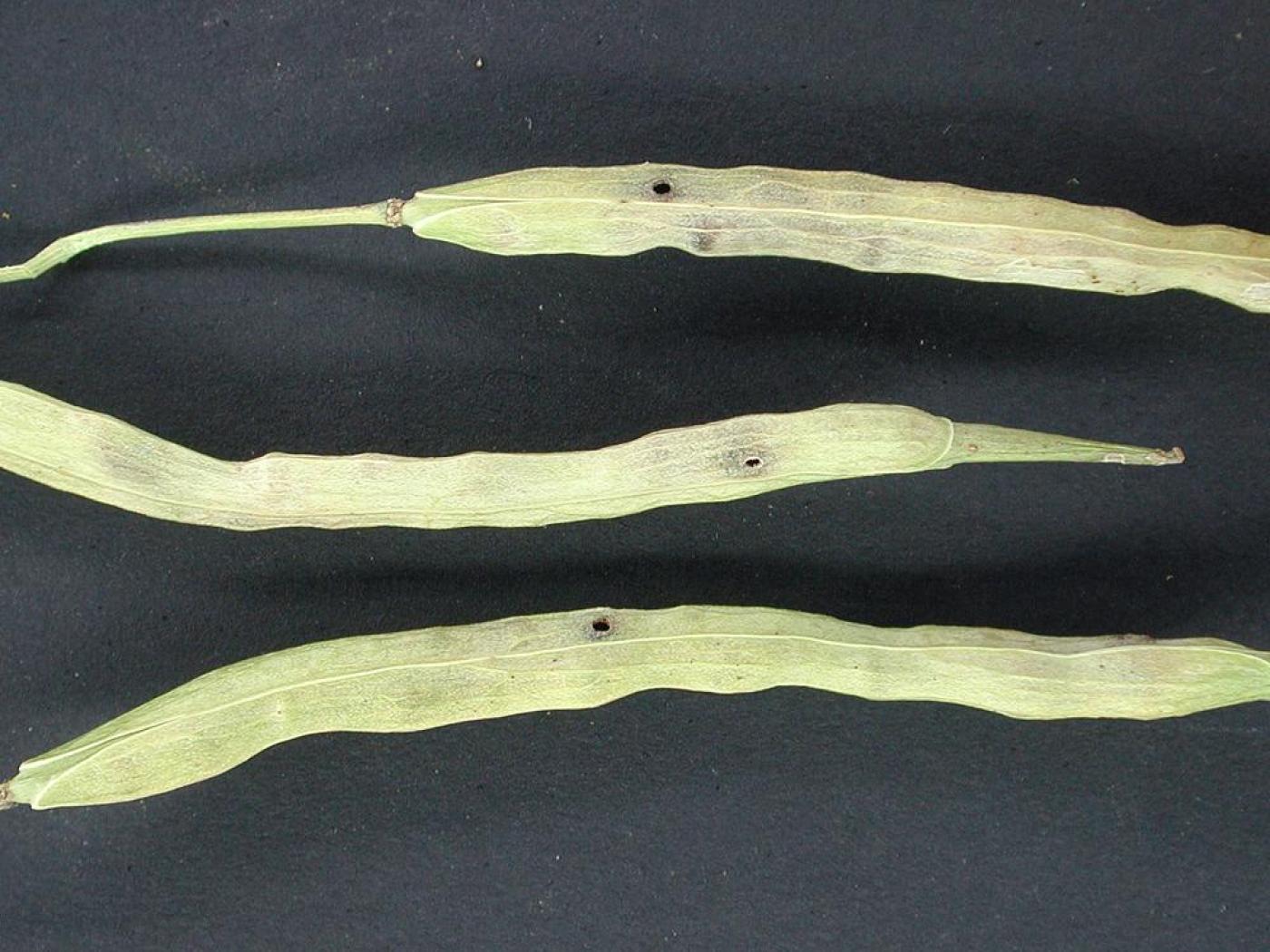 Trois siliques de canola présentant des dommages causés par la larve du charançon de la silique : la larve se nourrit des graines présentes dans la silique. Une fois son développement complété, elle quitte la silique en creusant un trou et se laisse tomber au sol pour se transformer en pupe.