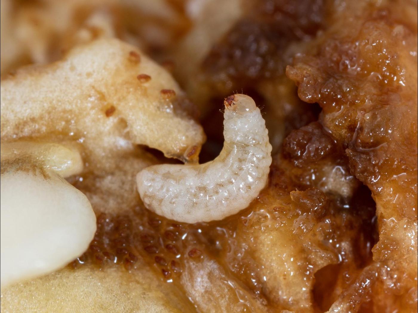 Lorsque les fruits mûrs sont attaqués, ils atteignent tout de même la maturité, mais ils contiennent des excréments et sont ponctués de zones de tissus en décomposition.