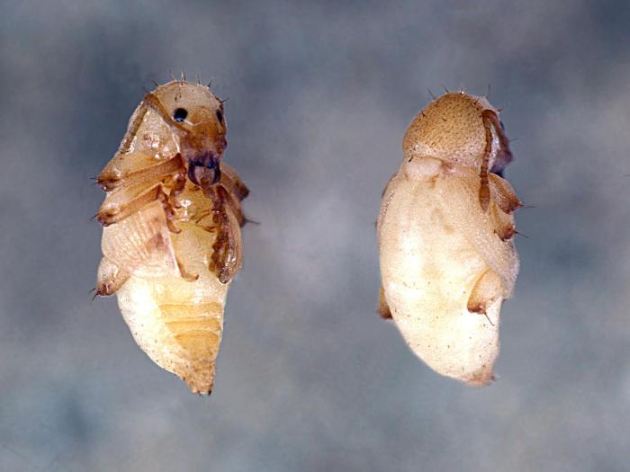 Pupe : 8,0 à 11,0 mm; elle est de couleur crème avec plusieurs parties sclérifiées brunes; les soies sont robustes sur la tête et le pronotum; les pièces buccales et les pattes sont différenciées.