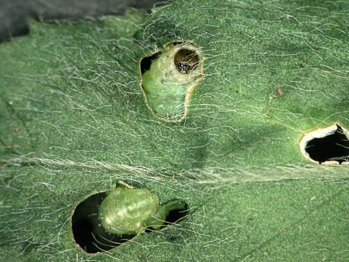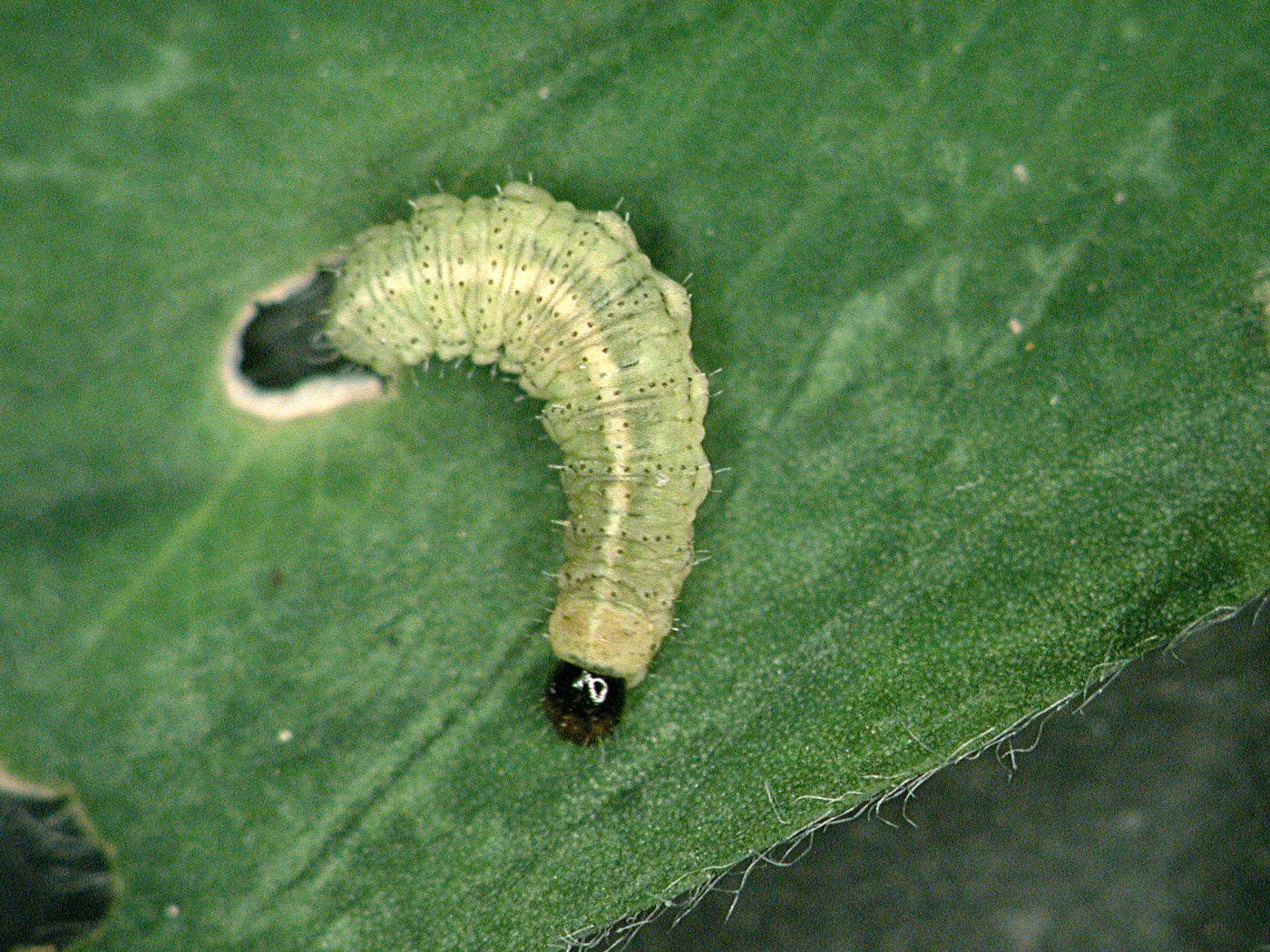 Larve : 4,0 à 7,0 mm à maturité; la tête est noire; le corps est vert avec une ligne dorsale médiane pâle; de minuscules tubercules noirs sont disposés en ligne sur les segments thoraciques et abdominaux.