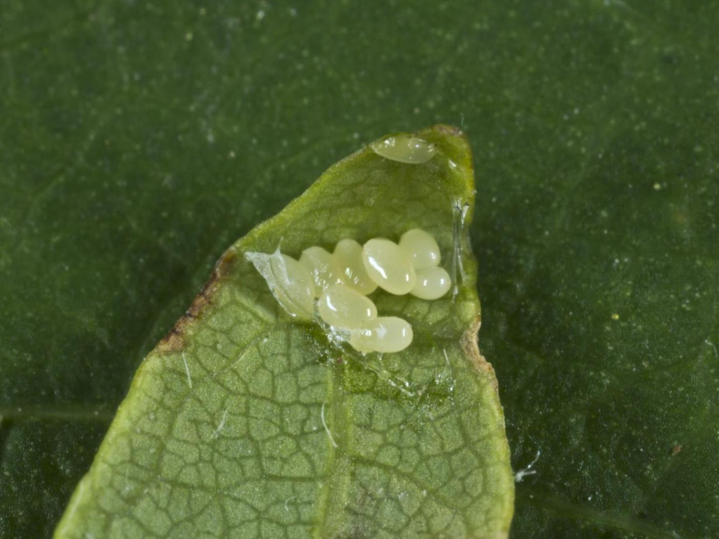 Oeuf : 0,5 mm; il est de couleur jaune verdâtre et luisante; il est entouré d'une substance visqueuse et collante lui permettant de se recouvrir de l'extrémité de la feuille.