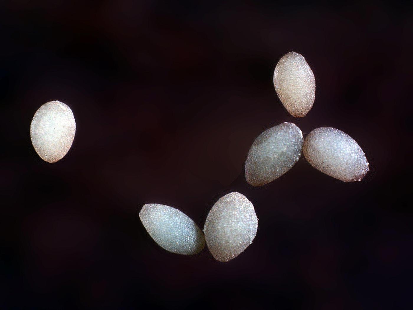 Oeuf : environ 0,6 mm; il est de forme ovale; il est blanc ou beige.