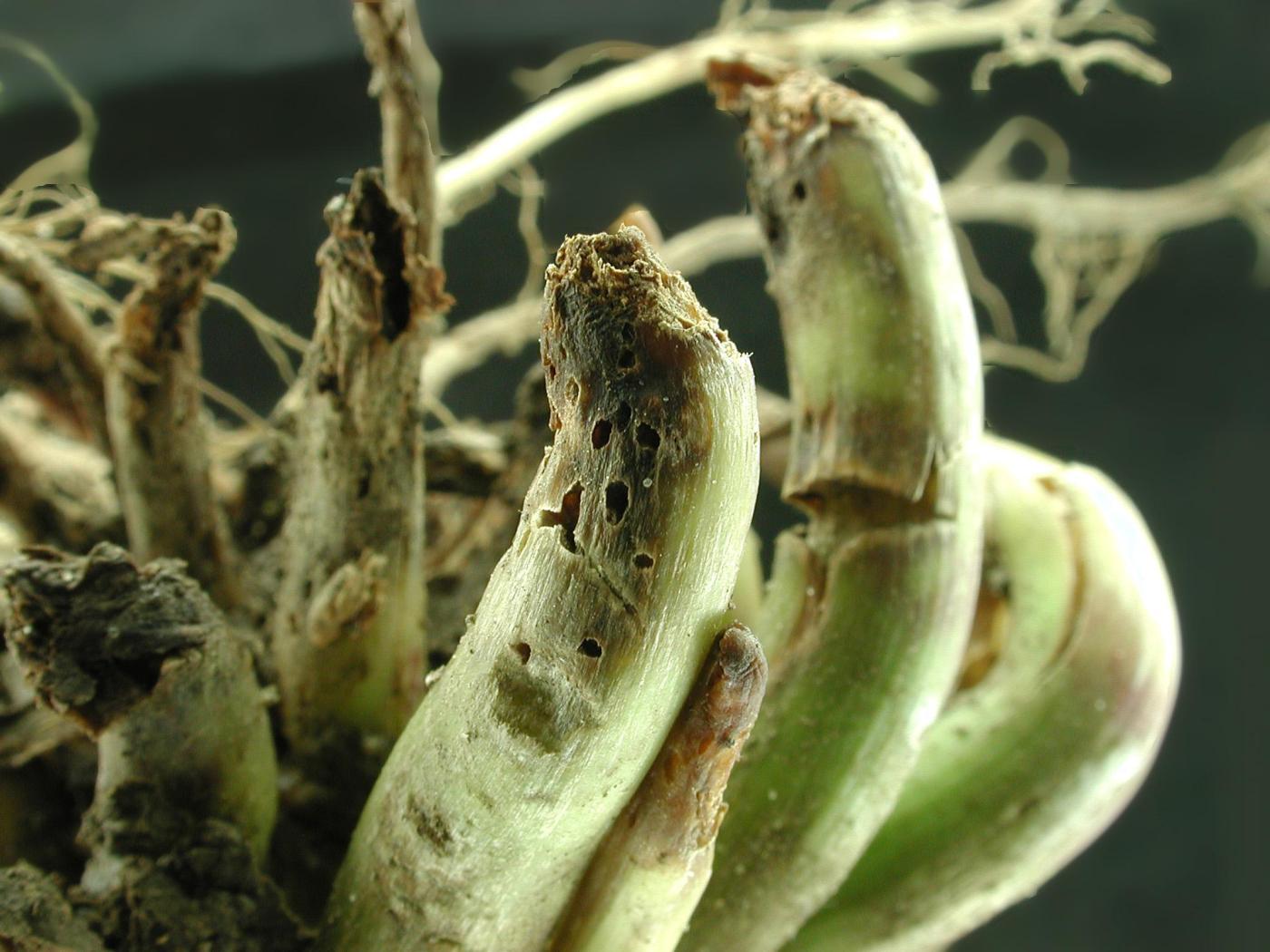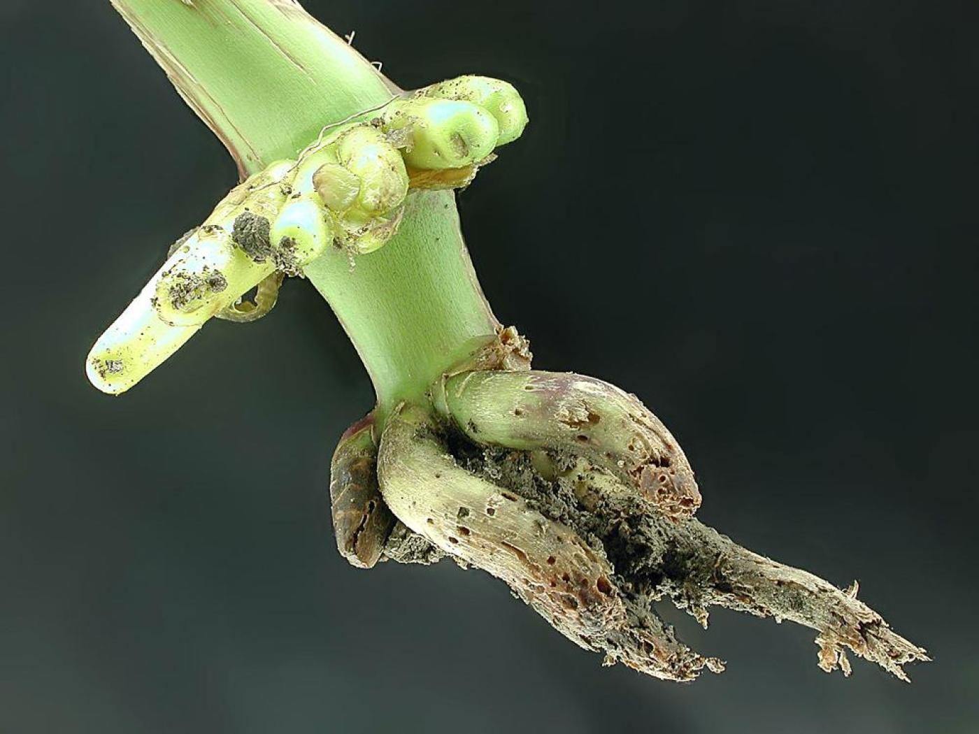 Racines d'ancrage de maïs présentant des trous causés par des chrysomèles des racines : les larves se nourrissent presque exclusivement de racines de maïs. Les jeunes larves grignotent les radicelles alors que les larves plus âgées creusent des galeries dans les racines d'ancrages. Les plants endommagés sont alors susceptibles de pencher ou de verser. Certains plants prennent alors la forme d'un col de cygne lorsqu'ils se courbent vers le haut dans un effort pour se redresser. Les larves trans…