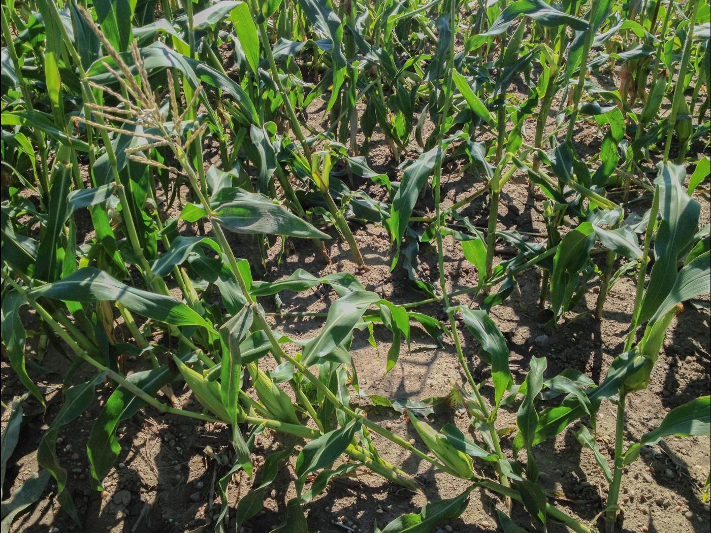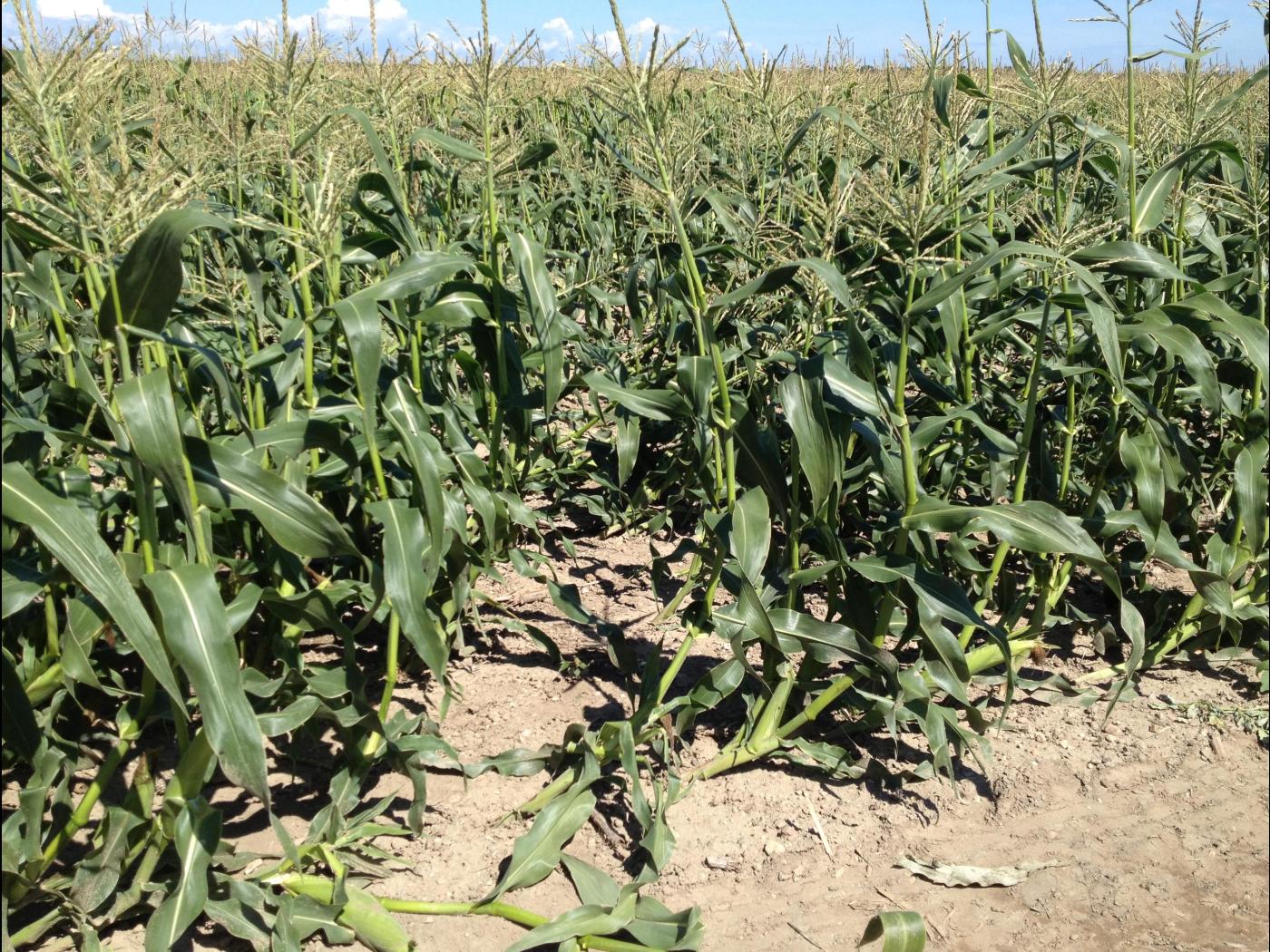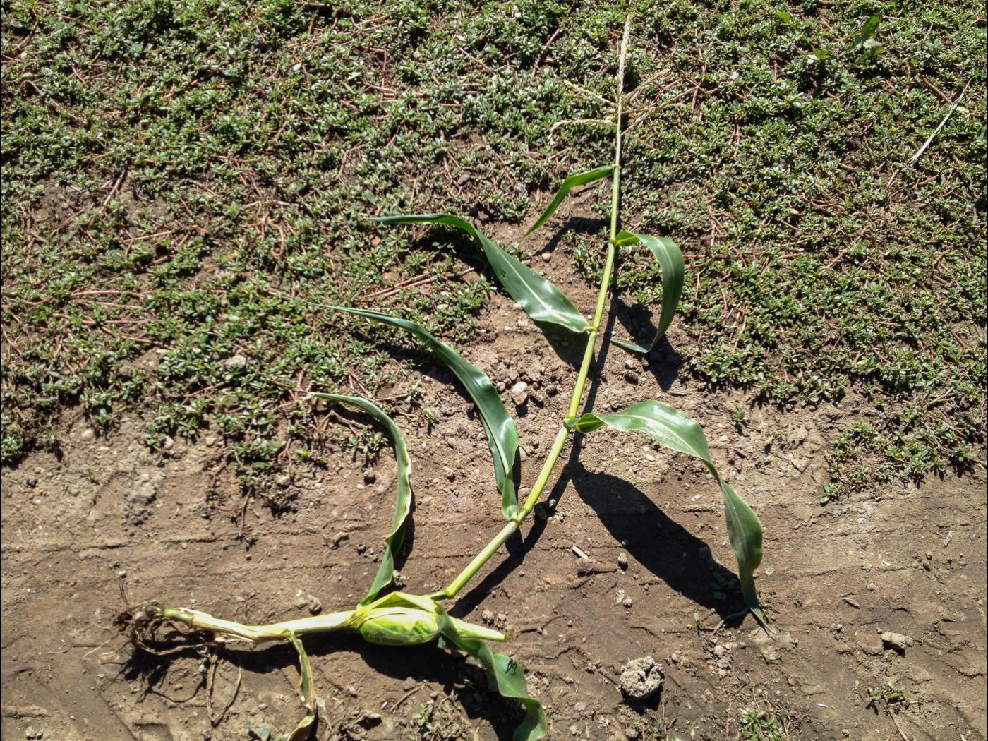 Description: Des plants de maïs avec la tige recourbée en forme de col de cygne, symptôme résultant des dommages causés par des chrysomèles des racines : les larves se nourrissent presque exclusivement de racines de maïs. Les jeunes larves grignotent les radicelles alors que les larves plus âgées creusent des galeries dans les racines d'ancrages. Les plants endommagés sont alors susceptibles de pencher ou de verser. Certains plants prennent alors la forme d'un col de cygne lorsqu'ils se courbent vers le haut…