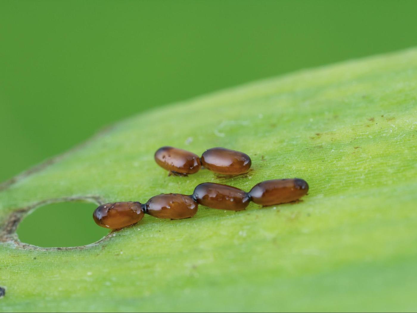 Oeuf : 1,0 mm de long par 0,5 mm de large; il est de couleur brun orangé à rouge; une fine couche de gélatine recouvre les masses d’œufs qui sont généralement disposés de façon linéaire; la petite tête noire de la future larve est visible un peu avant l'éclosion.
