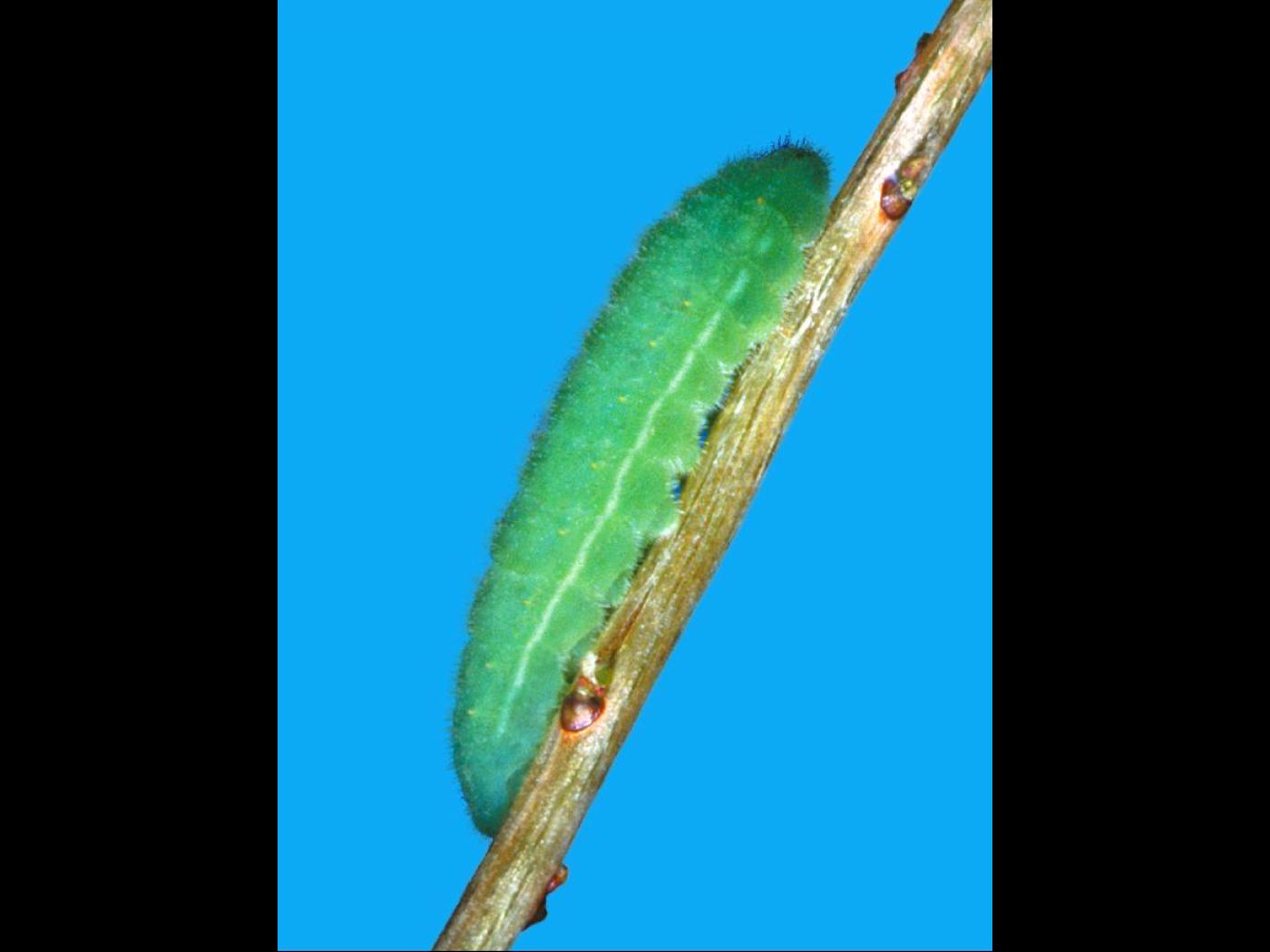 Larve : 15,0 mm à maturité; le corps est vert-bleu; la tête est rétractée sous le thorax; les pattes sont courtes et peu visibles; une fine ligne latérale blanche traverse le corps; elle présente une pilosité courte et dense d'aspect velouté.