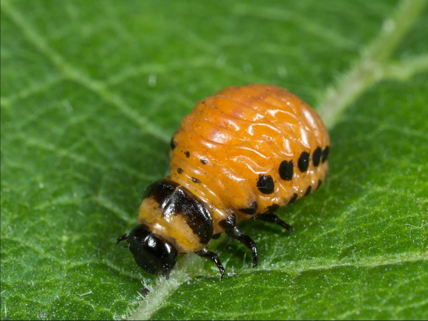 Larve : 9,0 à 15,0 mm à maturité; le corps est rougeâtre chez la jeune larve tandis qu’il est orangé chez la larve plus âgée; la tête, la plaque thoracique et les pattes sont noires; l’abdomen est très convexe avec deux rangées de taches noires sur chaque côté.