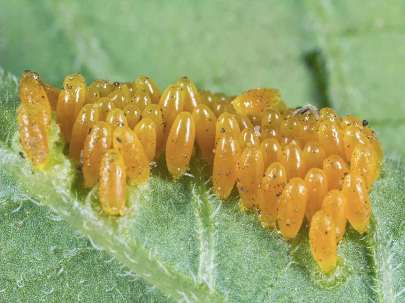 Oeuf : 1,7 mm de longueur par 0,8 mm de largeur; il est de forme ovoïde et de couleur orange.