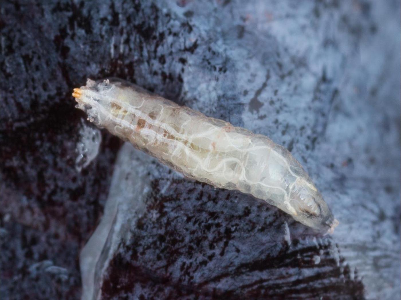 Larve : 6,0 mm à maturité; le corps est sans pattes; de couleur blanche ou jaunâtre et quelque peu translucide; deux petits tubes respiratoires sont présents à l’extrémité de son abdomen.