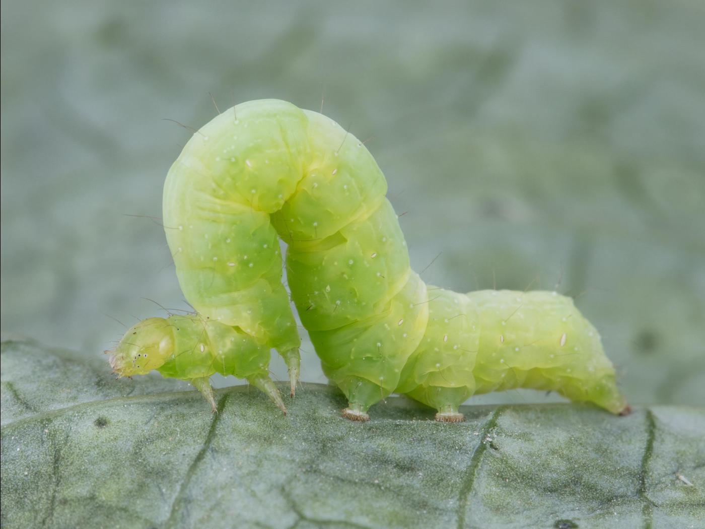 Larve : 35,0 mm à maturité; le corps est vert clair; des bandes longitudinales blanches sont présentes sur le dos; elle possède trois paires de pattes antérieures et trois paires de fausses pattes sur la région postérieure du corps.