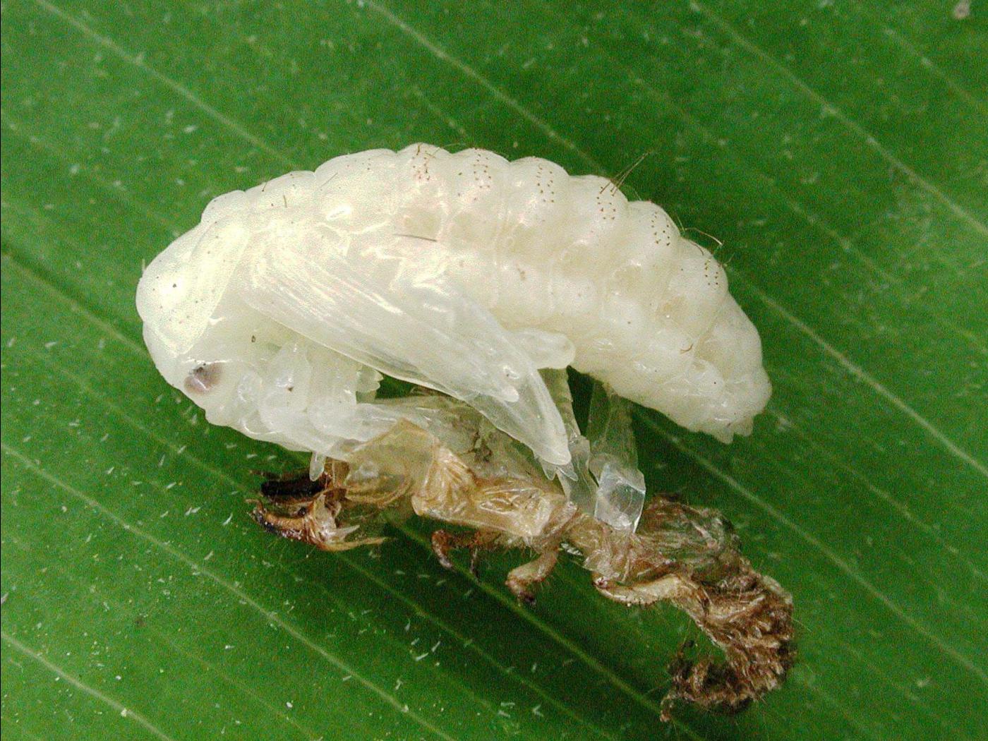 Pupe : 10,0 à 15,0 mm; le corps est blanc et légèrement recourbé; toutes les parties du corps sont différenciées, mais non sclérotisées; deux rangées transverses de soies sont présentes sur les segments abdominaux.