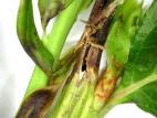 Les tiges infestées par cette chenille flétrissent et meurent. Le symptôme est généralement visible sur une longueur de 20 à 25 cm sur la tige. Puisque la larve endommage principalement les jeunes pousses, les plants de bleuet attaqués compensent en produisant de nouvelles branches.