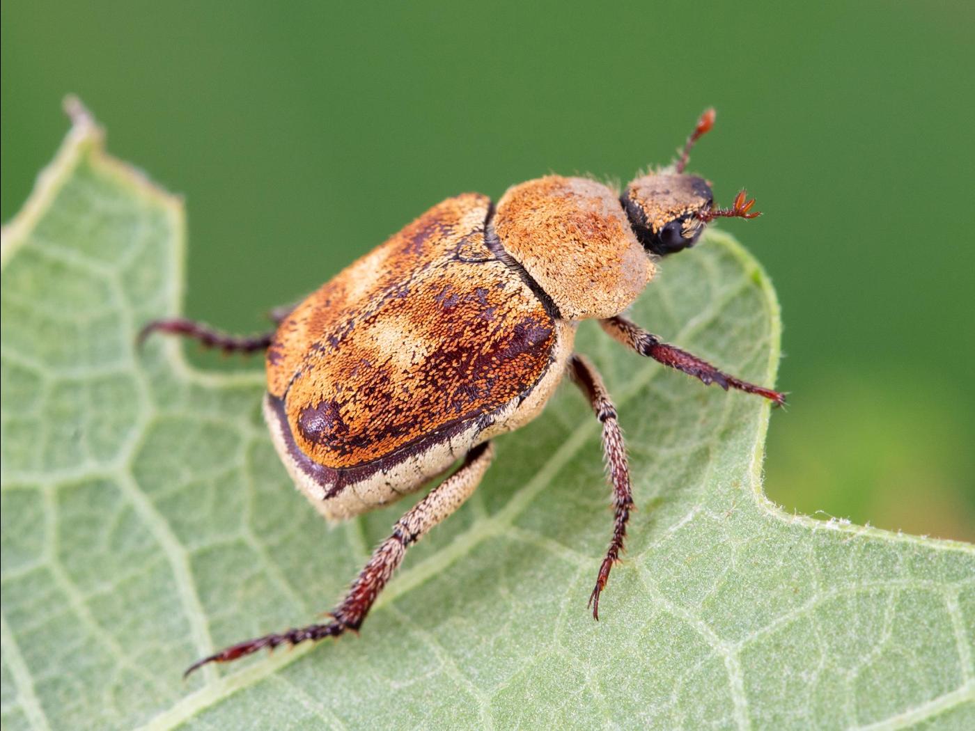 Adulte : 7,5 à 12,0 mm; la femelle est brun rougeâtre tandis que le mâle est plutôt noir; les deux sont recouverts d'une pubescence, dorée chez le mâle; les pattes postérieures se terminent par une longue griffe.