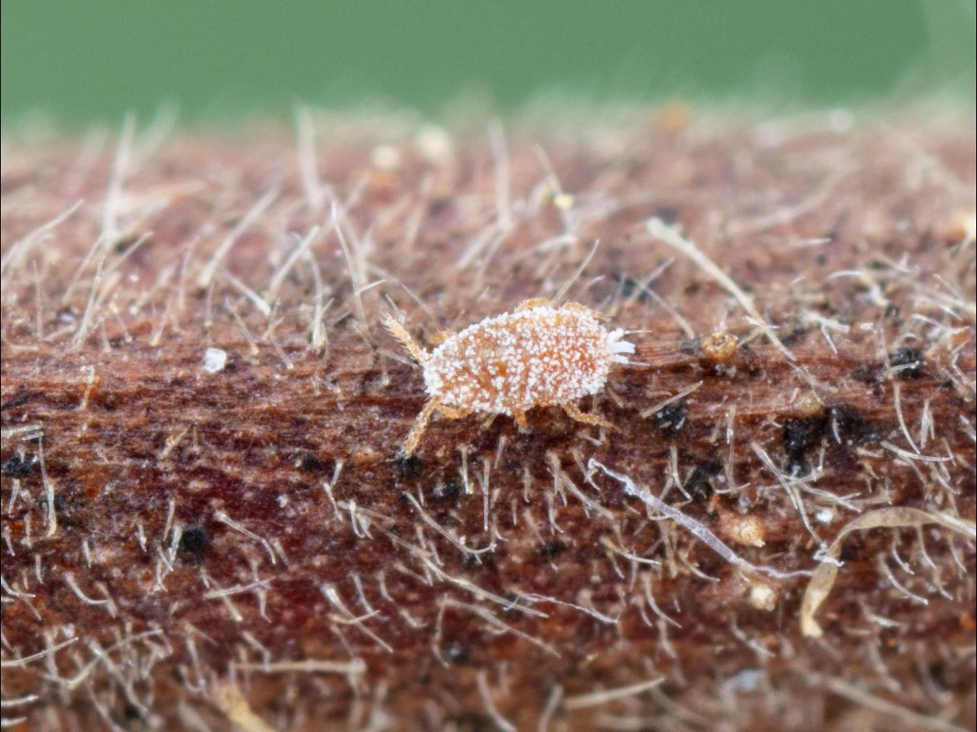 Larve : 2,6 à 3,5 mm; le corps est ovale et très aplati; elle est brune au centre et plus pâle sur les côtés; les jeunes larves (nommées crawlers) ont des pattes bien développées.