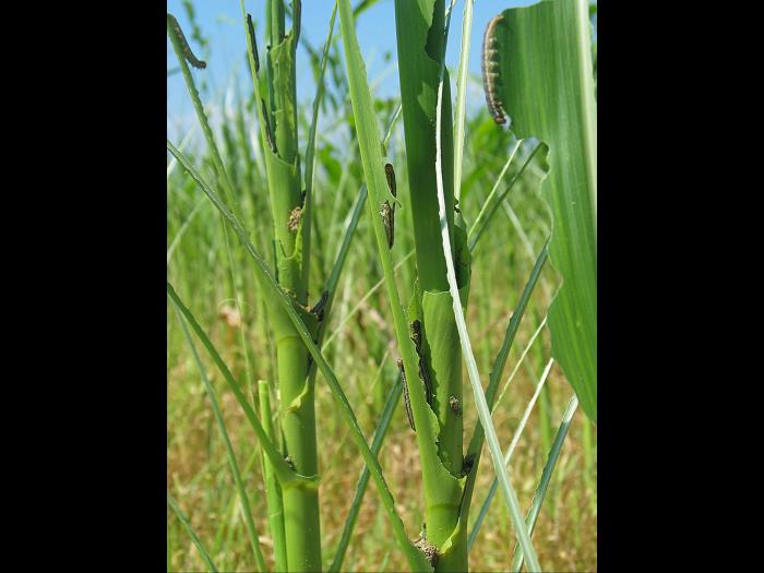 La légionnaire uniponctuée est principalement associée aux plantes de la famille des graminées. Elle s’attaque principalement aux céréales et au maïs, mais elle peut aussi se retrouver sur une multitude de cultures légumières ainsi que sur plusieurs mauvaises herbes. Les dommages sont causés par les larves qui grignotent les feuilles, causant parfois une défoliation très sévère des plants.