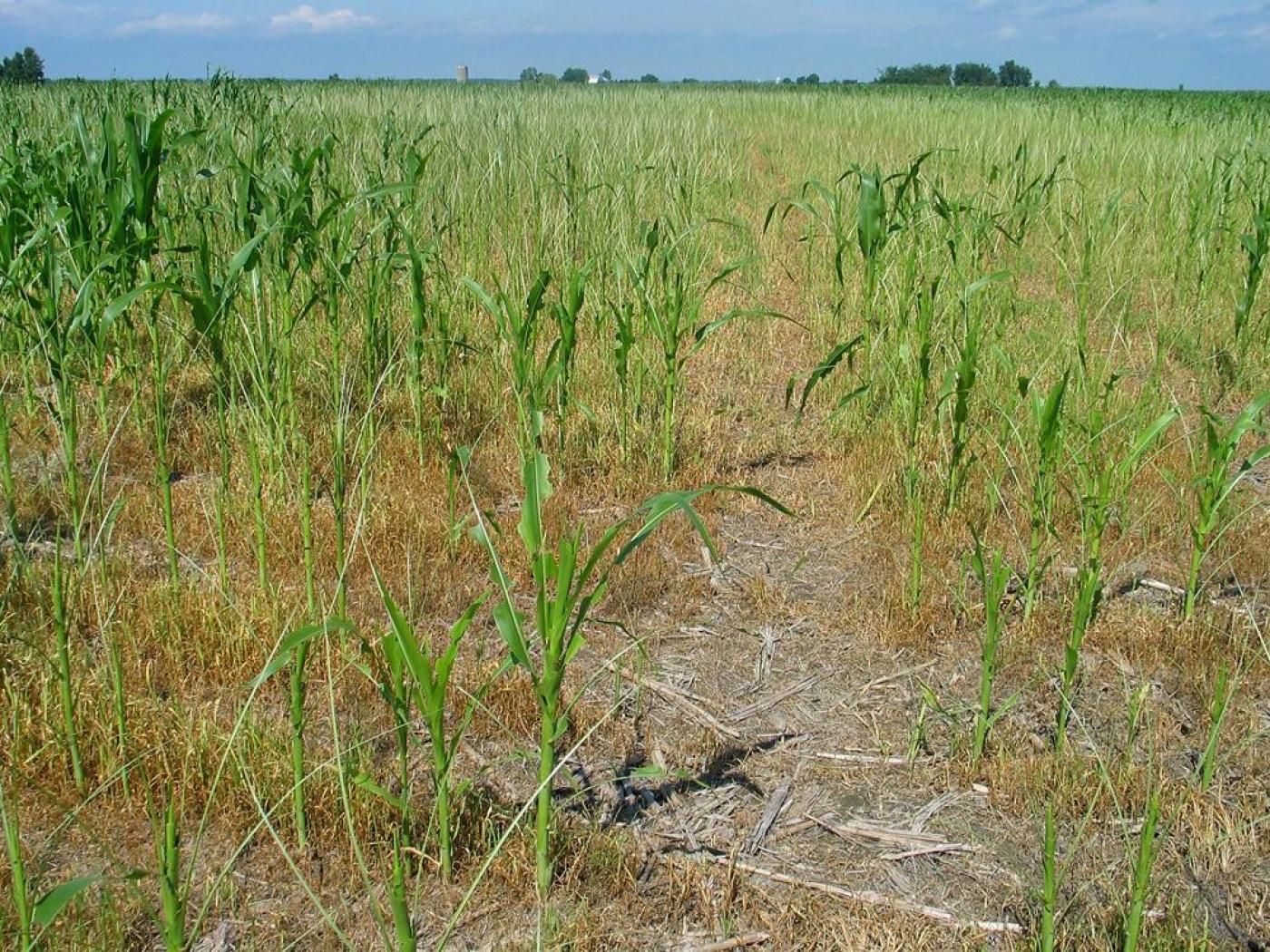 Description: Champ de maïs sévèrement endommagé par la légionnaire uniponctuée : ce ravageur est principalement associé aux plantes de la famille des graminées. Il s’attaque principalement aux céréales et aux maïs, mais peut se retrouver sur une multitude de plantes horticoles ainsi que de mauvaises herbes. Les dommages sont causés par les larves qui grignotent les feuilles, causant parfois une défoliation très sévère des plants.