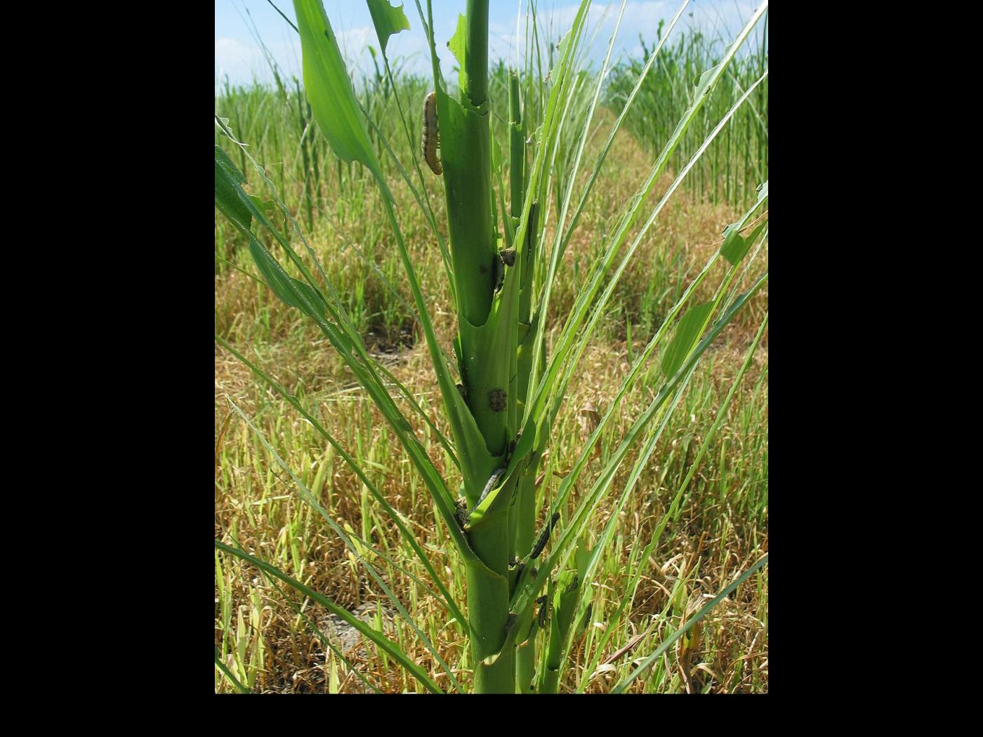 Description: Plant de maïs sévèrement endommagé par la légionnaire uniponctuée : ce ravageur est principalement associé aux plantes de la famille des graminées. Il s’attaque principalement aux céréales et aux maïs, mais peut se retrouver sur une multitude de plantes horticoles ainsi que de mauvaises herbes. Les dommages sont causés par les larves qui grignotent les feuilles, causant parfois une défoliation très sévère des plants.